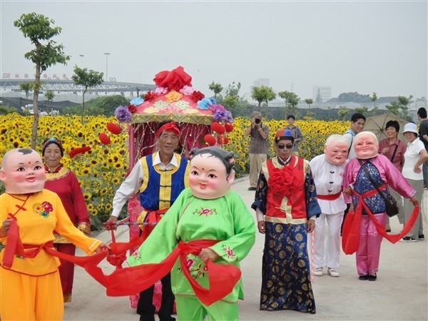 这二十年间,起初队员们自筹资金,不计报酬,自己动手制作各种道具。李师傅凭着精湛的竹艺,灵巧的双手又用竹簚扎了十对花篮和十对花灯,花篮漆上枣红色,插上各色绢花,可说是鲜艳夺目,花灯糊上各色的绢布,写上祥福的字词,灯沿的八个角上扎上小葫芦和流苏,系上绳子,穿上薄薄的小扁担,挑起来一颤一颤的,煞是好看。随后我们又扎了两只荡河船,一支摇橹,队员们纷纷自愿地拿出了各色被面,把两条船装扮的非常漂亮,船在前面荡悠悠,橹在后面划得欢。同时又扎了三只蚌壳精,这样演出时,前面舞龙,后面挑花灯,随后两只荡河船,最后三只蚌壳精。长长的队伍有几十米长,煞是好看。二零一零年,为了庆世博,我们又扎了一顶花轿,有新娘、新郎、媒婆、轿夫和吹打手。同时还添置了八只大头娃娃,演出时真是热闹欢腾,喜气洋洋。现在,在村领导的支持,文化站和社区学校的关心和援助下,近浦村的民间文艺演出不断发展,更趋完善。