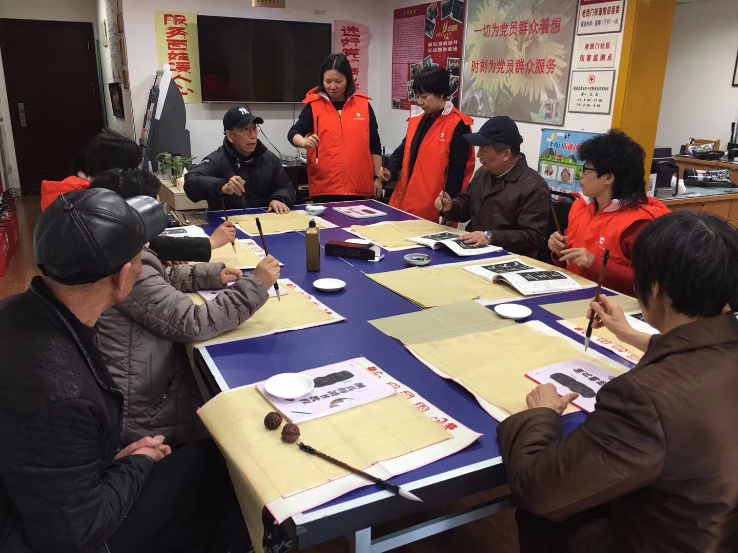 书法学习和鉴赏。因学员多数为无书法基础人员,团队从基础知识开始教学活动。 初步掌握书写的姿势,和执笔的方法,做到“头正、身直、臂开、足安”。了解毛笔书写的特点。了解我国书法发展的历史。介绍基本书体:颜、柳、赵、欧体,分类出示范本,边欣赏边讲解。掌握基本笔画的书写特点。横、撇、竖、捺、点等基本笔画书写。