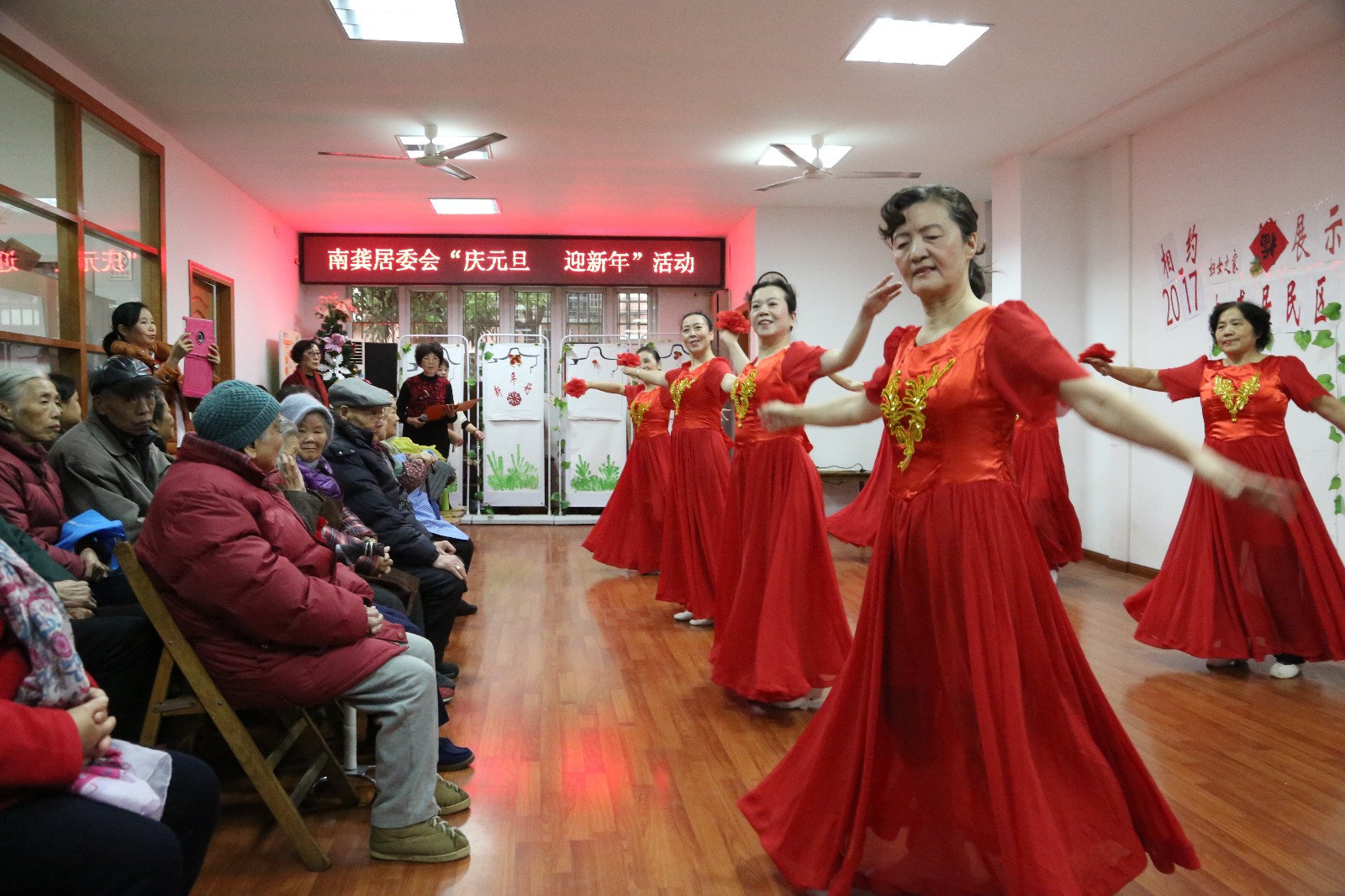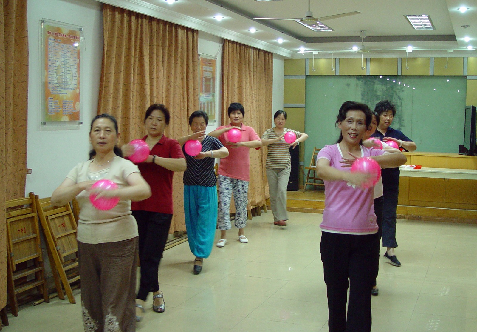 漫步在伊犁南路24弄小区里,经常可以看到一群穿红着绿的阿姨随着音乐轻歌曼舞,或敲起腰鼓,或挥动扇舞,或扭起秧歌,舞姿是那样轻盈自如,整齐划一,还真有点专业水平。从上世纪九十年代末期,以健身为娱乐开始,起初这个舞蹈队就有20余人断断续续参与,而表演队伍则固定在12人,她们当中年龄最大的64岁。她们每周的活动日程排得满当当的,日子过得十分充实。她们自发自愿聚拢成一个集体,做什么事都要从集体出发,买服装、做道具都尽量从节约考虑,只要是舞蹈所需的,不管是哪一个,首先想到的都是这个集体。她们经常说,自从加入舞蹈班这个集体后,得到镇党委政府、村党支部领导的肯定及大力支持和家人的充分理解,大家和睦相处,团结有加,每天心情特别好,回到家,做起家务活来还不时地哼着曲子,走着舞步,很快干完一大堆家务活。现在大家谁也离不开谁,有谁生个小病小痛的,大家都去看,形成了良好的社会风气和团结友爱、互帮互敬的道德风尚。