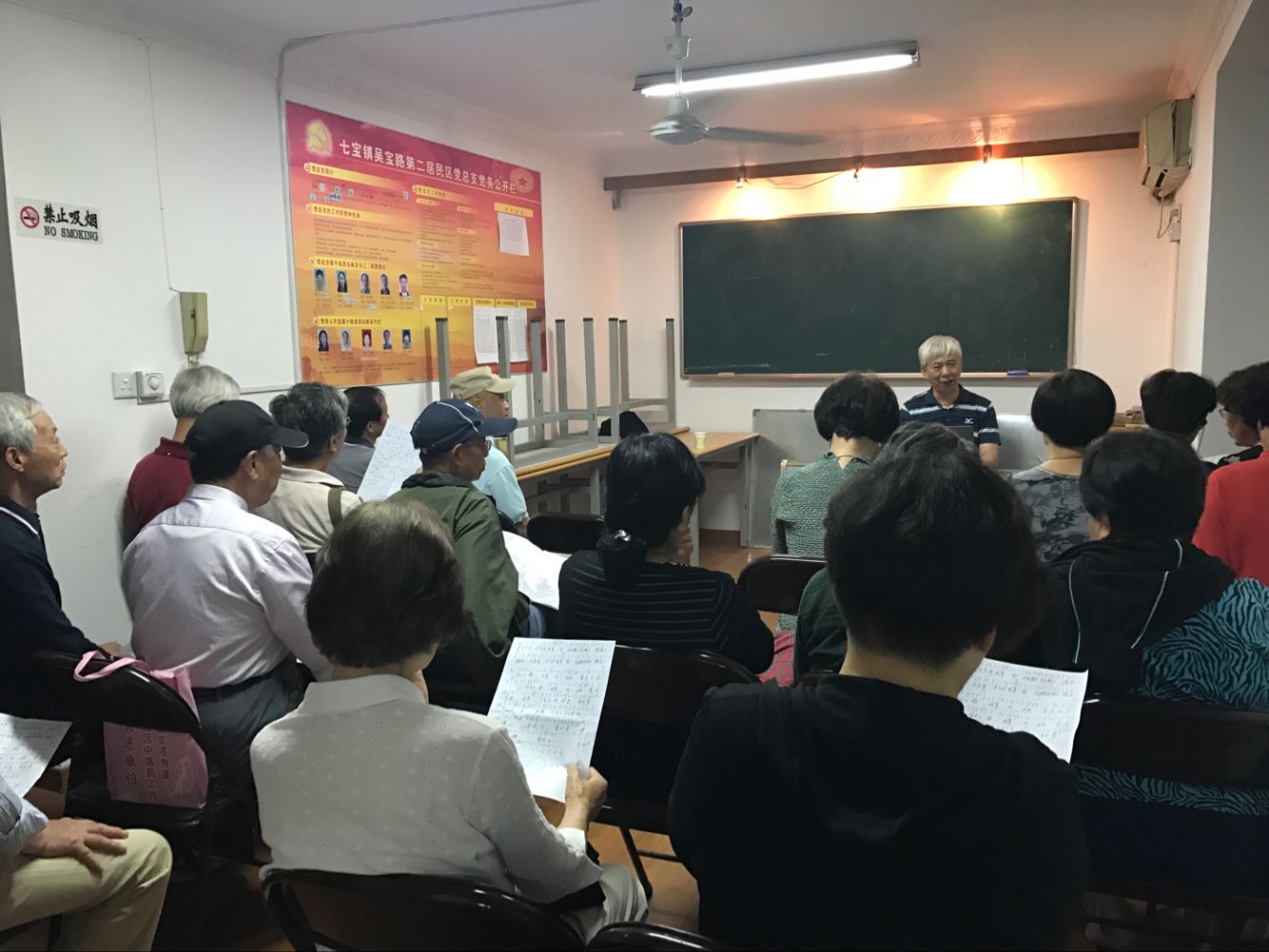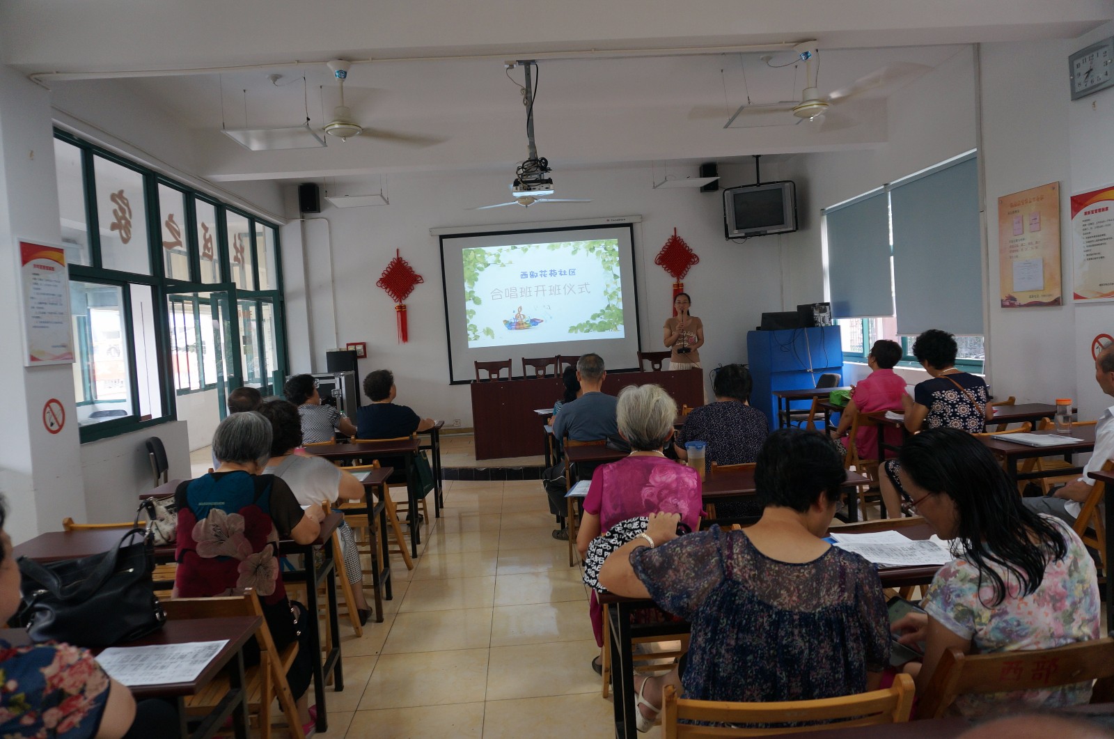 合唱队共设有队长1名、指导老师1名、伴奏老师1名、社区联络员1名。队长由学员民主推选,主要负责教学安排及学员联系;指导老师由共建单位区文化馆派送的专业声乐教师担任,进行开展日常教学;伴奏老师由社区中的退休音乐老师担任,配合开展训练课程;社区联络员由居委会文体干部担任,负责活动策划及经费管理。至今,合唱队伍日益壮大,已招收学员50余名,每年均有新学员加入。合唱队教学点设于小区内的“社区之家”多功能活动室,配有电脑、投影仪、音响等多媒体播放设备,并设有3名活动室管理人员,负责场地的日常管理,为教学开展提供了良好的环境和设备支持。