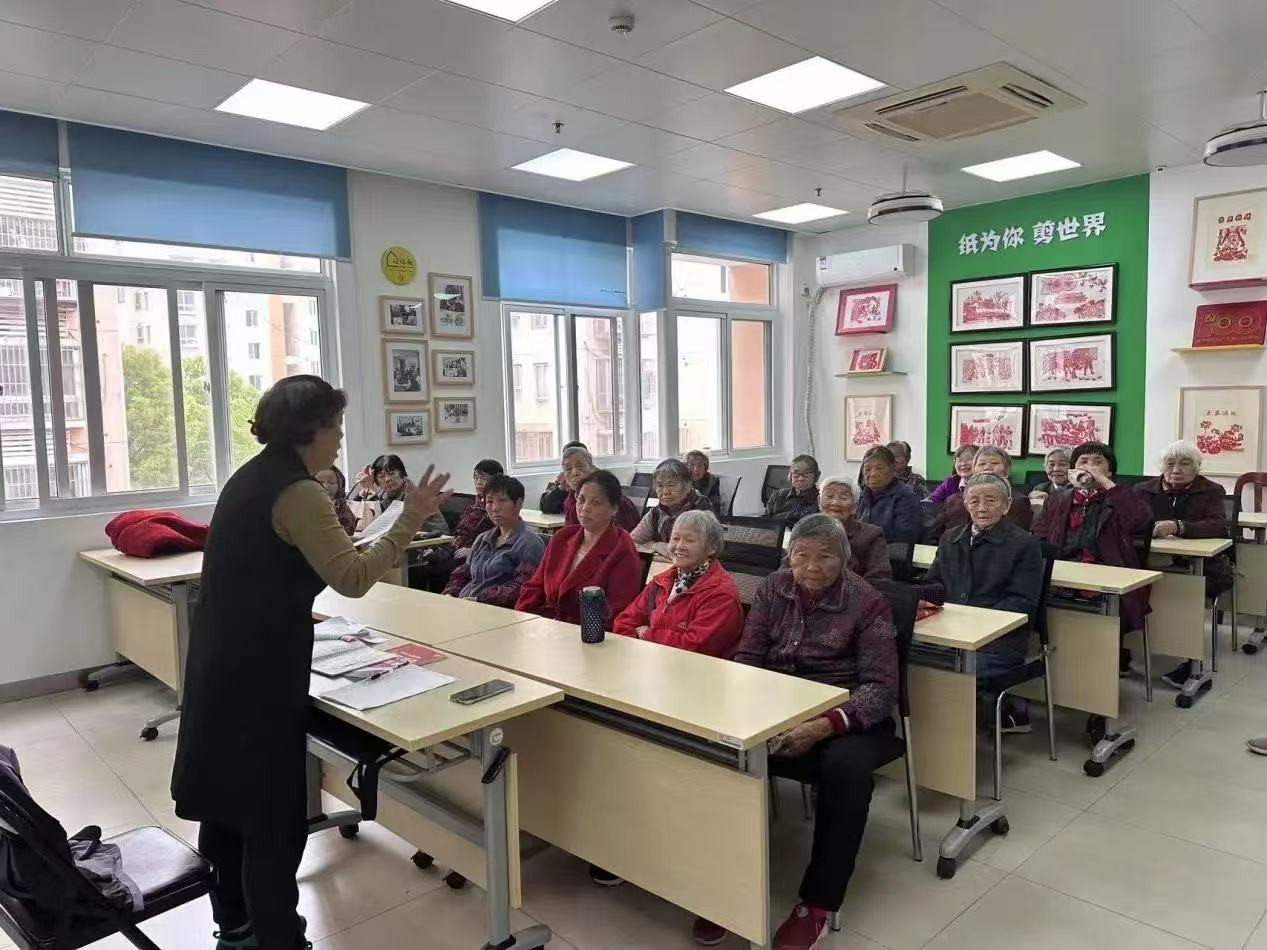 每周一次的读书活动,不仅涵盖了健康保健、科学养身,还致力于传播法律知识、文明法规等,老师们根据老人们的实际需求,每月制定课程计划,每周都将课程内容备好,同时为了让老人们方便理解,老师们多数都是用本地话来讲课,通俗易懂的课程内容和生动幽默的讲课风格,长期吸引了社区内30余位老年居民前来参加,受到了大家的热烈欢迎。其中,最受老人们欢迎的莫过于拍拍手、拍拍腿的小游戏,课堂里笑声一片。之所以设计这样的环节,张老师也有自己的考虑:“我的课堂前半部分大家都是坐着,老人坐时间长了腿脚难免会麻木。通过拍拍手、拍拍腿这样的小游戏,可以让大家稍微活动一下,这样出门时就不会摔跤了。”她始终坚信,平平安安来上课,健健康康回家去,是教育的最高宗旨。