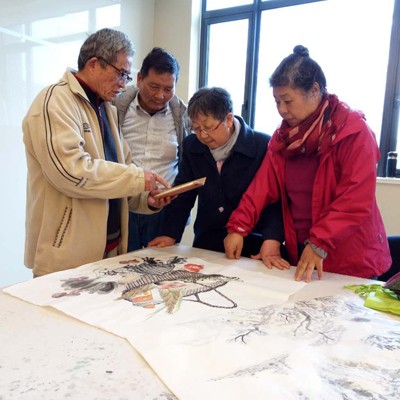 南新四居松鹤书画社成立于2003年7月,学员以社区居民为主,同时吸引周边小区的书画爱好者共同参与,学员年龄最大的102岁,最小的36岁,平均年龄70多岁。几年来学员不断在交替更新,每期都有近三十多名学员,每周坚持开展内容丰富、形式多样的活动。从2004年开始组建了以党员为班长、居民区积极分子为核心的松鹤书画班理事会。由理事会牵头,采用自我管理,自我服务,分工合作,共同管理的模式,开展各项事务。为了体现书画班的特色,在党支部领导和理事会的领导下,采用请进来、走出去的方式开展教学工作,隔周交替开展书法、国画及沙龙,请专人教学。