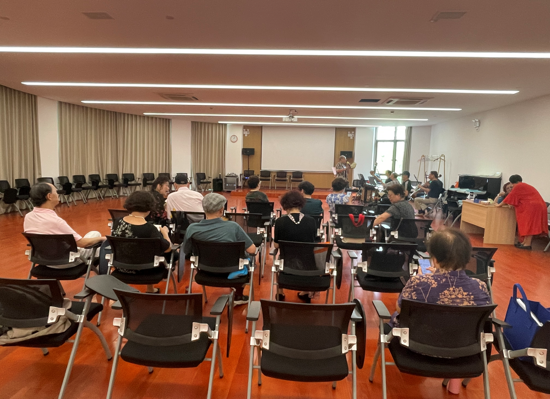 在飘鹰居委会的大力支持帮助下,居委会给合唱队提供了固定的训练场地、电子琴、歌谱,并由小区党员沙老师排练和指挥。成立之初,居民们的演唱水平参差不齐,大多数只是爱好者,音乐基础有欠缺,对演唱多声部的合唱作品比较吃力。通过大家一起学新歌、练旧曲,合唱队的演唱水平不断提升,近几年来,合唱队多次参加小区举办的文艺演出。