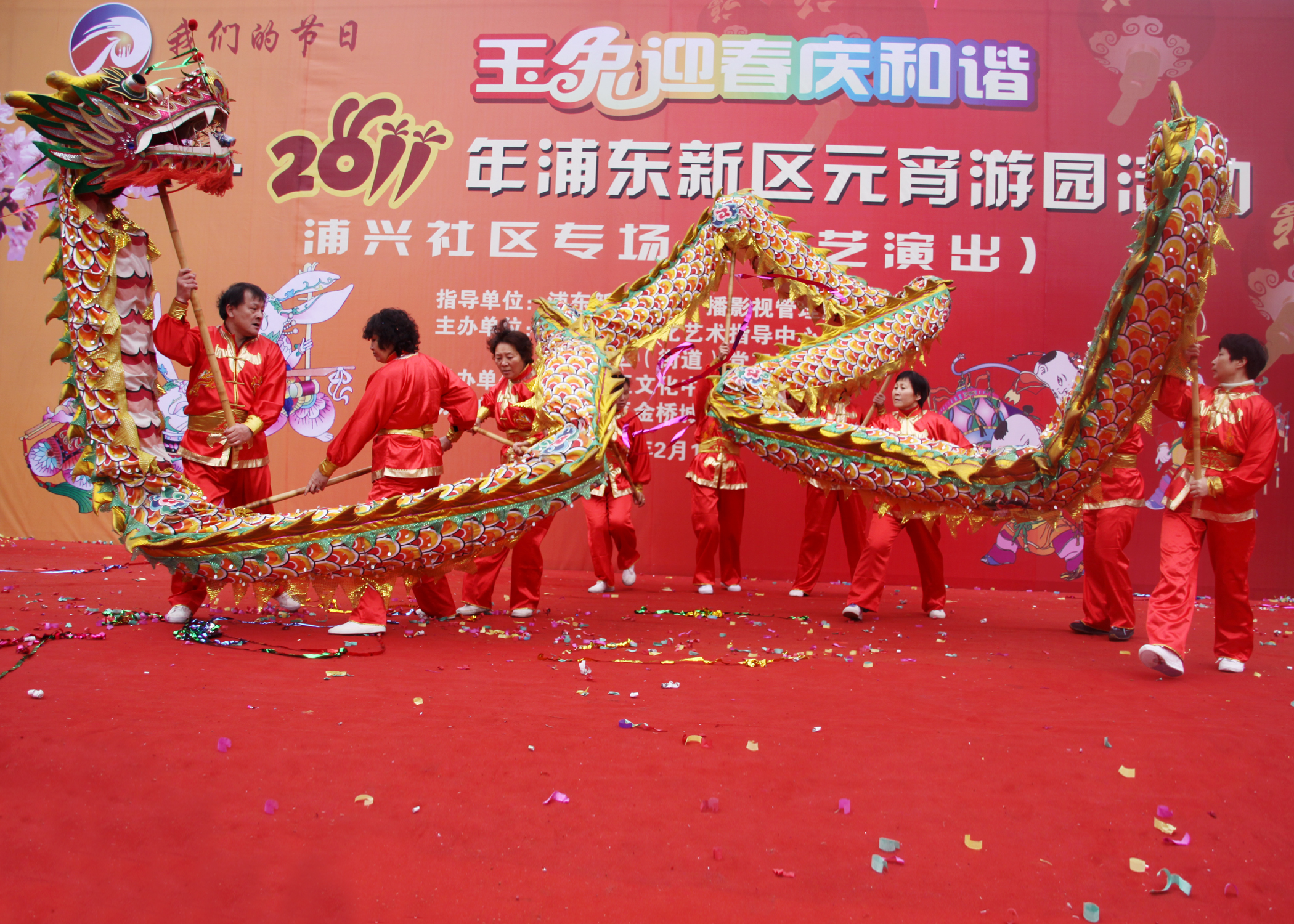 浦兴街道舞龙队成立于2002年5月,上海市浦东新区浦兴路街道舞龙队成立于2002年5月,从原有的一条龙,发展到现在的三条大龙、九条小龙;队员也从十余人发展到四十余人。舞龙队频繁活跃在各大小舞台,如春节、元宵节、健身节开幕式、艺术节开幕式等大型活动中都可见到他们的身影。