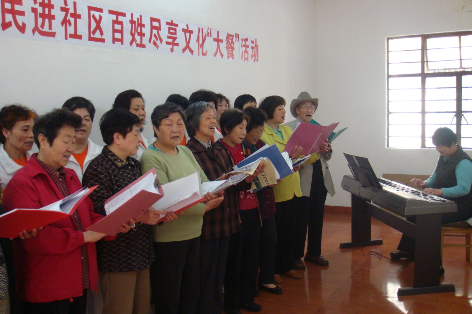 中山社区的夕阳红合唱团成立于2016年年初,发起的初衷是为了让小区内众多喜爱唱歌的居民们有一个学习交流的机会。通过热心居民的介绍,我们请来了一位有一定水准的老师,来帮合唱队义务进行上课指导。前期的报名工作超乎想像的火爆,有近50位居民送上了报名信息。合唱队正常的活动是一周一次,每次活动约1.5小时,大家一起在老师的指导下学习唱歌的各种知识,交流各种信息,相处氛围一直很和谐欢乐,最美不过夕阳红。