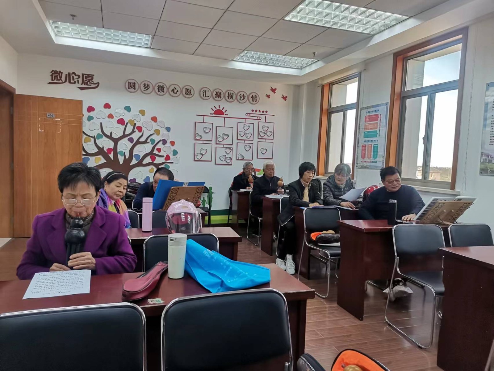 虽然开始学员们嚼字还不是很准,但是随着一遍一遍的跟读以后,渐渐变得符合标准了,唱歌学英语中“雪绒花”“映山红”学唱时,学员在悠扬的旋律中,充满激情和快乐,意犹未尽。