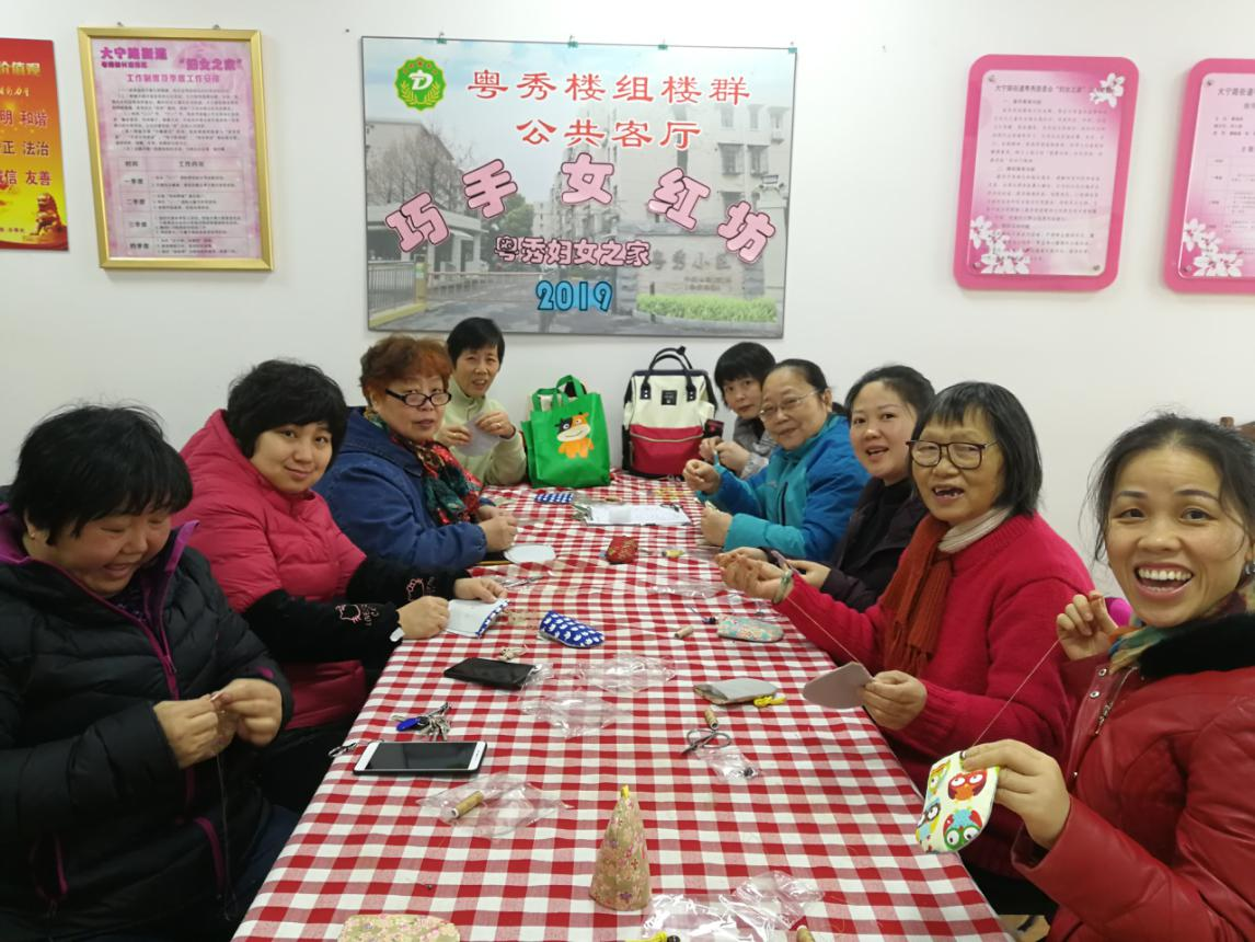 2019年初,在大宁路街道妇联的的支持下,粤秀居委会将这些有着相同爱好的姐妹们组成了一个不分年龄、不分职业的“粤秀巧手女红坊”家庭文化传承社团。这个社团的成立源于对现代文化城市社区的一种“补位”,在探索以文化元素凸显标识、以文化方式打造品质、以文化行为激发活力的“拾遗之路” 社团成立后,居委会专门邀请了辖区“女红达人”周秀珍作为指导老师,每周定期开展活动。周秀珍主要宣传环保理念,教大家循环利用,绿色生活,让废旧衣物大变身。女红爱好者们纷纷从家里带来了旧衣物,在周老师和社团其它姐妹的参谋下,裁、烫、拼、缝纫..... 制作出一件件新作品。 粤秀巧手女红坊致力于服务社会,2019年5月份由粤秀女红坊制作的“爱心杯垫”、“小零钱包”,经大宁路街道妇联送到云南偏远山区的贫困孩子们的手里。2019年12月粤秀巧手女红坊通过社区爱心义卖向蓝天下的至爱捐款。2020年3月粤秀巧手女红坊分2次给将制作的40多只棉质口罩赠送给辖区在一线的抗疫志愿者们,并将爱心的“女红”作品,将送给辖区孤老。 2021-2022年的疫情期间,女红坊的活动虽然暂时中断,但女红访的志愿者们却闲不下来。她们在家中继续“变废为宝”,制作出大量的手工拖鞋,毛袜,毛线帽子……并把成品送到慈善进行义卖,将这份“大爱”一直传递出去。