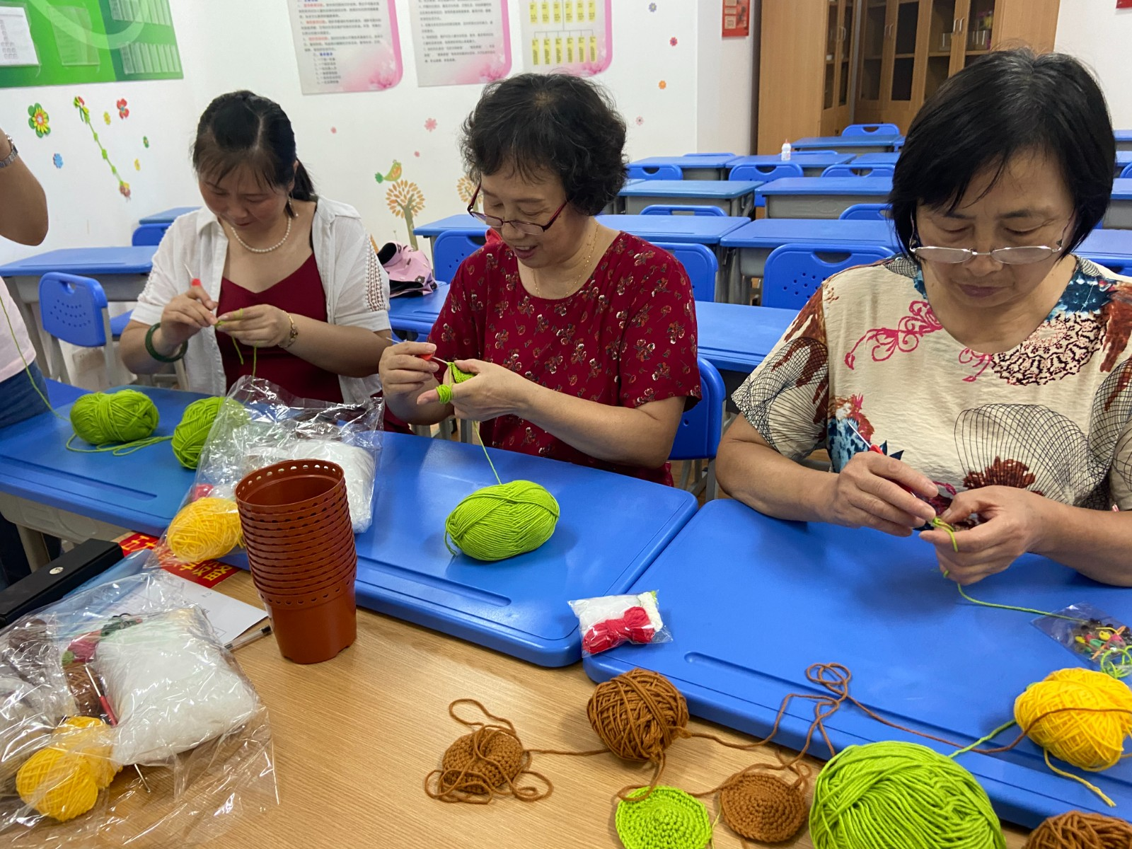 庆阳社区“一线牵”钩针组,以社区钩针达人袁建芬为组长,居民朱萍、张晓红、陈艳为组内骨干,居民杜逸群、单杏妹、罗冬娣、董安琪、韩小梅、刘丽君等成立了15人钩针小组,经过了两年的发展居民逐渐加入团队。