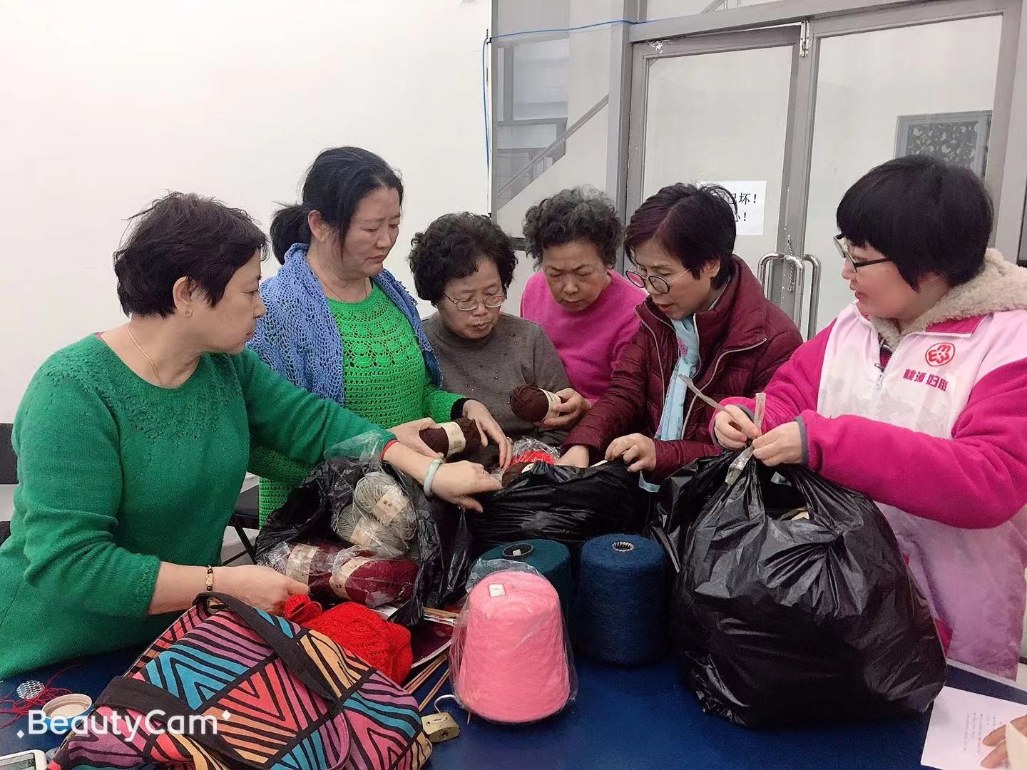 阳光三委爱心编织队成立于2015年,最初由3位居住在社区的退休阿姨自发组成,现有更多人加入进来,已发展为一支12人的固定活动团队,并于每周三下午在阳光三期老年活动室定期开展活动,大家聚在一起交流编织经验。